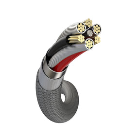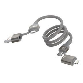 Selbstaufrollendes 4-in-1 Magnet-Ladekabel in Grau, ordentlich aufgewickelt, mit 60W Fast Charge Hinweis und Adaptern für USB-C und Lightning.