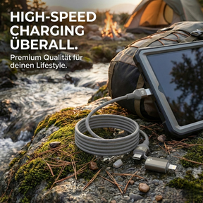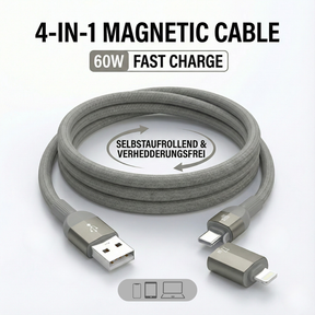 4-in-1 Magnetisches Ladekabel (60W) – Selbstaufrollend & Verhedderungsfrei | USB-C, Lightning & USB-A